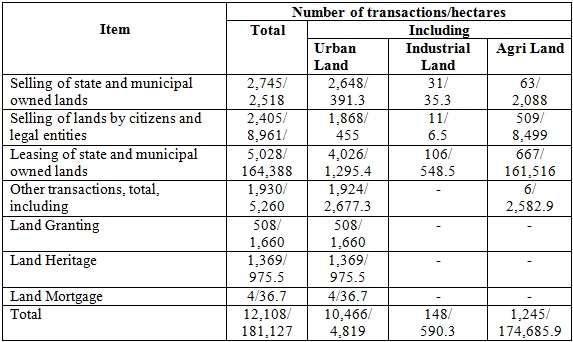 The state’s land monopoly in Russia was abolished and two main forms of land ownership: public uses and private farming were introduced. Land may be converted into individual private property of citizens for personal use, farming, horticulture, and animal husbandry as well as to accommodate buildings and constructions for individual enterprise, to build and maintain dwelling houses, country cottages, garages. In 2001, the Land Code based on market economy principles was adopted by the Russian Parliament. The Agricultural Land Market Act was introduced in February 2003. According to the Law any parcel of agricultural land may be sold or purchased. As a result the number of Agricultural Land Market Transactions has been increased. However, the total agricultural land area has been reduced.