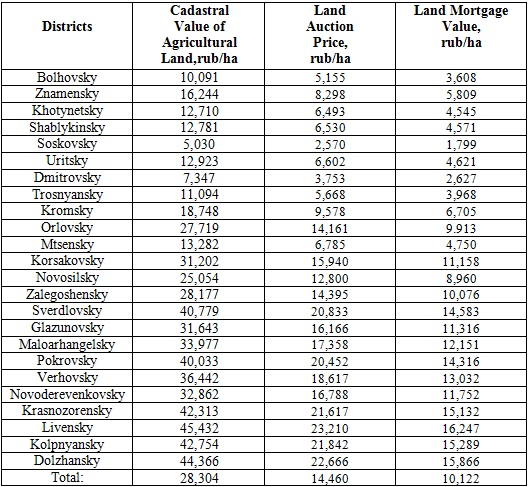 Development of Agricultural Land Market in Russian Federation is mostly depended on Regional Land Policies. One of the successful examples based on legal framework included the Federal Legislation as well as a local regulation is Orel Region Land Policy. In that sense it’s very important to make land cadastre information more understandable and transparent for customers. It must be pointed out that cadastral value of agricultural land is not applicable for Agricultural Land Market Transactions because there is no relation to market land value. As a result, the banks have not accepted cadastral value as a basis for Agricultural Land Mortgage Transactions. Because of it, outside investors as well as other customers have not been able to get reliable information about the value of agricultural land plots and participate as educated and well-informed agents (buyers or sellers) in Agricultural Land Market Transactions. Due to it the  Agricultural Land Mortgage Values were calculated on the basis of Land Market Auction Price Model for Orel Region.