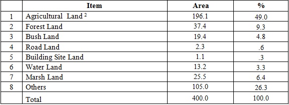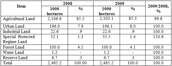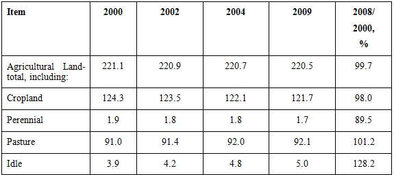 The cropland, perennial, pastures, hay field lands as well as idle land were amounted 196.1 million hectares or 49.0 % of total agricultural land area in 2009 (see Table 2).