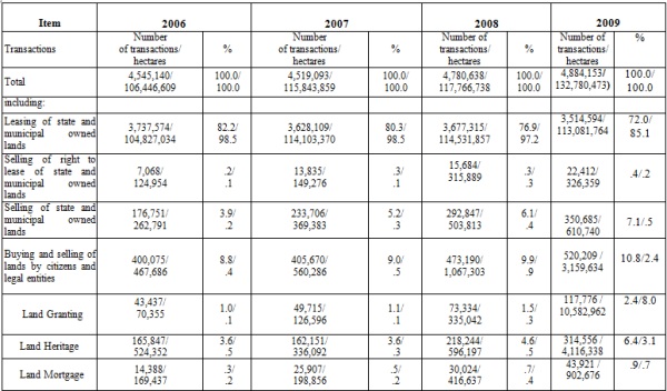 Table 5. Land Market Transactions, Russian Federation, 2006-2009, Number of transactions/hectares
