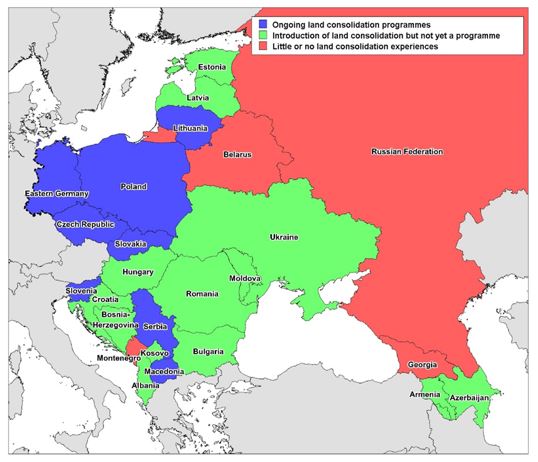 Most governments throughout Central and Eastern Europe have from the early 1990s and onwards recognized the need to address these structural problems hampering development of agriculture and rural development. This has led to the introduction of land consolidation instruments. FAO has played a leading role in supporting introduction of land consolidation and in the development of national land consolidation programmes. The FAO regional land consolidation programme has three main pillars: i) technical guidelines, ii) field projects in the programme countries and iii) the informal network of land tenure professionals interested in land consolidation, land banking, land market development etc. (LANDNET). FAO has so far implemented field projects in 10 countries in the region.