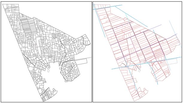 Figure 3: Majority-based land consolidation pilot project in Egri village in FYR Macedonia (2017). Parcel structure before (left) and after (right). The number of land parcels was reduced by a factor 4. Integrated rehabilitation of agricultural infrastructure (roads, irrigation and drainage).