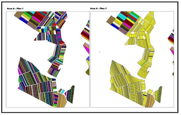 Figure 4: Voluntary land consolidation pilot project in Moldova (2008). Land ownership in part of Ghiduleni village before (left) and after (right) the project (small part of the project area).