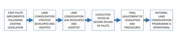 Even with strong political support, the experiences show that preparing for an operational national land consolidation programme takes time and needs to go through different stages from the first pilot implemented without specific land consolidation legislation to developing and adopting a land consolidation strategy and subsequently the legal framework. Then testing the legal framework in a second round of pilots and fine-tuning procedures and legislation based on pilot experiences. Extensive international technical assistance throughout the process will often be needed. Figure 5 illustrates the optimal process from introduction of land consolidation to an operational programme.